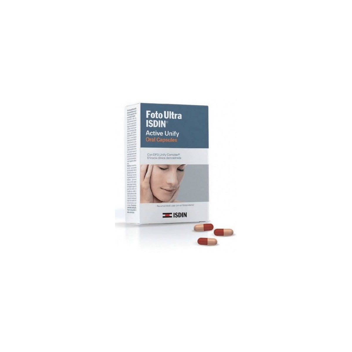 Isdin Fotoultra Active Unify es un complemento alimenticio que contiene vitaminas antioxidantes y DP2-Unify Complex (Pycnogenol y Vitis vinifera), que ayuda a proteger las células del estrés oxidativo inducido por la radiación UV. Prepara la piel frente al sol, la hace más resistente y contribuye a un bronceado más gradual, sin manchas, con un tono más uniforme.